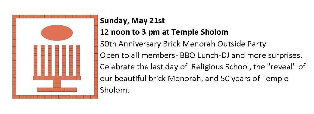 50th Anniversary Brick Menorah Ceremony & Outside Party Sunday, May 21, 2017 12:00 PM 3:00 PM Google Calendar ICS